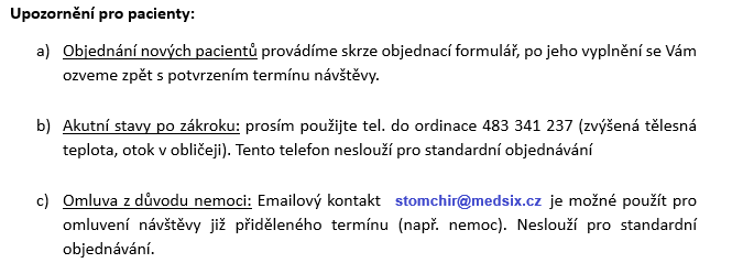 Telefon či email neslouží k objednávání. Na telefonu je možné řešit akutní stav po zákroku, emailem je možné omluvit předem domluvený termín. Děkujeme